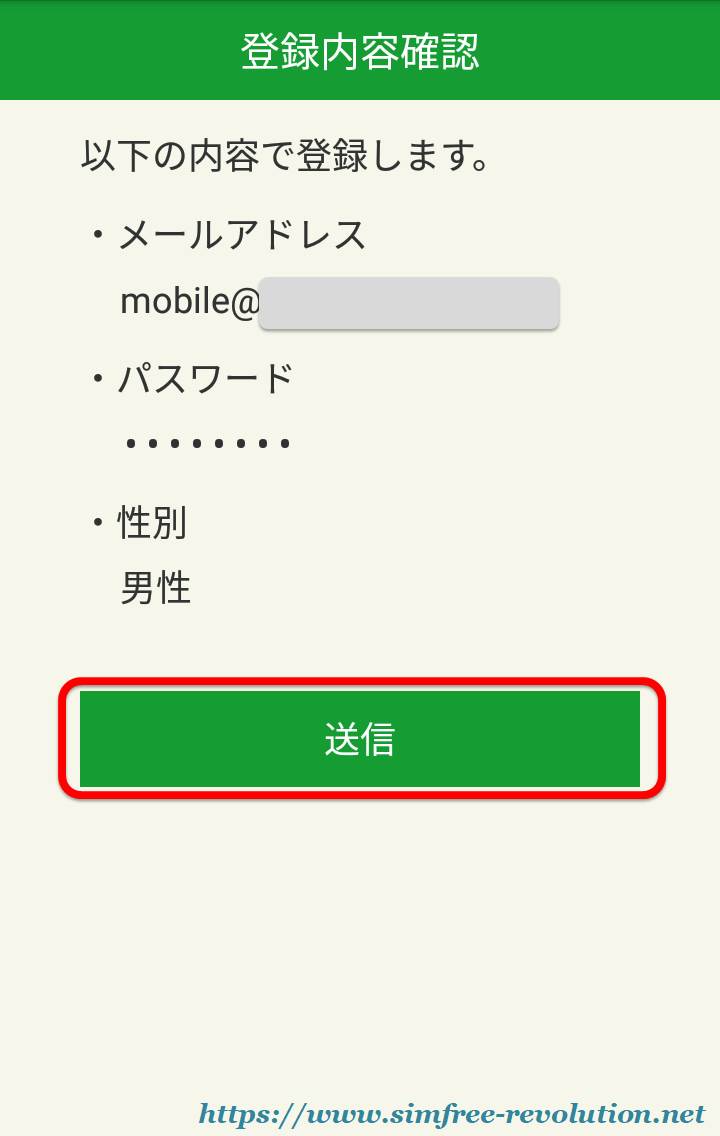 - 確認画面が表示されるので、メールアドレスに間違いがないことを確認して「送信」ボタンをタップします。
