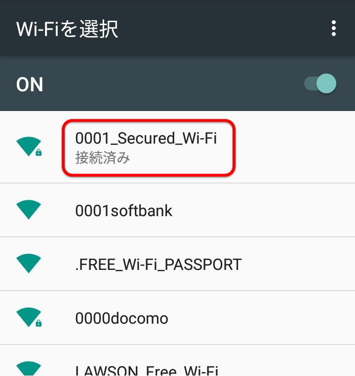 - Wi-Fiの画面リスト(参考:下画像)から「0000_Secured_Wi-Fi」か「0001_Secured_Wi-Fi」を探し、接続します(1度接続したことがあれば、2度目以降は自動で接続されます)